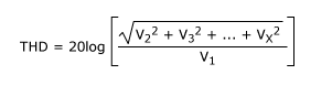 Total harmonic distortion (THD):The ratio of the RMS value of the distortion appearing at the input (DAC is the output) frequency integer multiplication point (harmonic) to the RMS value of the input (or output) sine wave. Only harmonics within the Nyquist frequency limit are included in the measurement. Typical values are expressed in decibels: